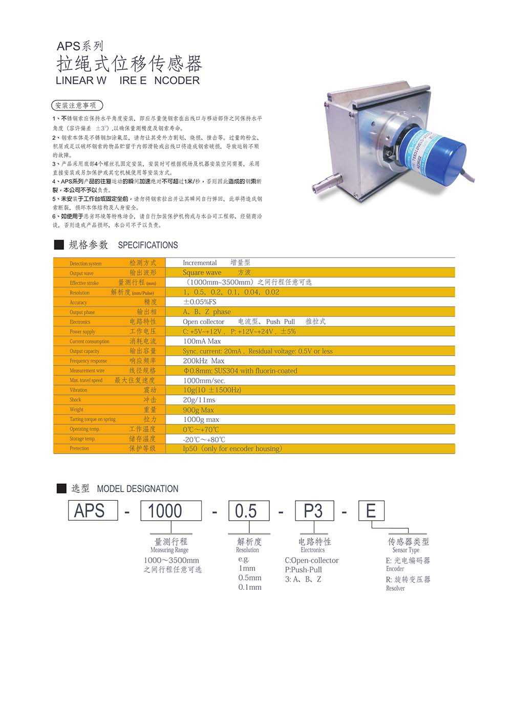 所屬型號:APS系列 所屬品牌:艾而特 所屬分類:拉繩式編碼器 應(yīng)用領(lǐng)域:紡織行業(yè) 電梯行業(yè) 機(jī)床行業(yè)
